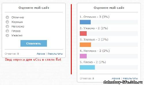 В данном посте мы с вами разберем и установим новый вид опроса для uCoz в стиле Flat дизайна. Что такое стиль Flat (Flat дизайн)? Это новый довольно популярный в интернете сейчас тип веб-дизайна, главной особенностью которого является плоскость и юзабельность. Теперь поговорим об этом виде опроса для uCoz. Главная его особенность это плоскость — тот самый Flat дизайн. Выводится количество и процент проголосовавших, а также полоски опроса разноцветные, заточен под 14 возможных ответов. Также данный вид опроса в стиле Flat построен полностью на CSS, что делает его очень легким и не утяжеляющим страницу. Установка очень проста Установка: Для установки, ... Читать дальше » |