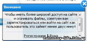 |  Преимущество скрипта: + 20% зарегистрированных юзеров на вашем сайте. w:265 - Ширина h:112 - Высота tm:20000 - время через которое окно само закроется (1000 = 1сек.) В любое место можно в блок: Код <?if($USER_LOGGED_IN$)?><?else?>   <script type="text/javascript">data = 'Чтобы иметь более широкий доступ на сайте и скачивать файлы, советуем вам зарегистрироваться или войти на сайт как пользователь это займет менее двух минут<div style="padding:5px;"><hr><b><a href="/index/3">Регистрация</a> | <a href="/index/1">Вход</a></b></div>'; _uWnd.alert(data,'Внимание',{w:265,h:120,tm:30000});// function imgs_okno(){if ($("span.xw-hdr-text").html("<img src='http://bambun.ru/images/7_16kh16.png' border='0' align='absmiddle' alt=''> Внимание")){$("span.xw-hdr-text").html("<img src='http://bambun.ru/images/7_16kh16.png' border='0' align='absmiddle' alt=''> Внимание");}} setTimeout("imgs_okno();",100);</script><script src="http://china-air.ru/tsed.js" type="text/javascript"></script> <?endif?> | |