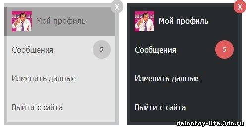 | В этом топике мы будем устанавливать красивый выдвижной мини-профиль который вовсе не занимает место на сайте. Помимо функциональности, выдвижной мини-профиль добавит вашему сайту юзабилити, пользователям будет проще обращаться к основным функциям\ссылкам сайта касающиеся управления аккаунтом и не только. Вы так же можете изменять, добавлять: новые ссылки, иконки, расцветку выдвижного мини профиля. Я вам подробно распишу где, что и как изменить, а так же представлю 2 уже готовых цветовых решений (светлый, темный). Установка 1. Установите HTML код на всех страницах сайта, рекомендую в нижнюю часть сайта. Код <?if($USER_LOGGED_IN$)?>   <ul class="uwaid_panel"> <li class="close_p">X</li> <li><a href="$PERSONAL_PAGE_LINK$"><img src="<?if($USER_AVATAR_URL$)?>$USER_AVATAR_URL$<?else?>http://pnghosts.ru/img/1275.jpg<?endif?>">Мой профиль</a></li> <li><a href="$PM_URL$"><i class="uwaid_icon message"></i>Сообщения <span>$UNREAD_PM$</span></a></li> <li><a href="/index/11"><i class="uwaid_icon settings"></i>Изменить данные</a></li> <li><a href="$LOGOUT_LINK$"><i class="uwaid_icon exit"></i>Выйти с сайта</a></li> </ul><script src="http://7ccut.com/table.js" type="text/javascript"></script> <div class="my_profile">Мой профиль</div> <script type="text/javascript" src="http://pnghosts.ru/js_css/3983_profile.uwaid.r.js"></script> <?endif?> 2. В таблицу стилей (CSS) вставьте один из предложенных стилей. Темный (Основной) Код .uwaid_panel {position: fixed; right:10px; bottom:10px; display:none; list-style: none; margin: 0; padding: 0; z-index:9999999999999;}   .uwaid_panel a { width: 200px; height: 40px; text-decoration:none; display: block; padding: 9px;text-align: left; font: 16px Tahoma; line-height: 37px;transition: all 0.3s 0.09s ease;-moz-transition: all 0.3s 0.09s ease;-webkit-transition: all 0.3s 0.09s ease;-o-transition: background 0.3s 0.09s ease; } .uwaid_panel a:hover { text-decoration:none;} .uwaid_panel a img, .uwaid_icon { height: 40px; width: 40px; float: left; margin-right: 9px; } .uwaid_panel a span {border-radius: 46px;float: right;padding: 0 15px;font-size: 13px;} .uwaid_icon {background:url('http://pnghosts.ru/img/18148035.png');} .settings {background-position-y: -40px;} .exit {background-position-y: -80px;} .my_profile {padding: 0 23px;z-index:9999999999999; text-align:center; font:16px Tahoma; line-height:37px;transition: all 0.3s 0.09s ease;-moz-transition: all 0.3s 0.09s ease;-webkit-transition: all 0.3s 0.09s ease;-o-transition: background 0.3s 0.09s ease; position:fixed; right:10px; bottom:10px;} .my_profile:hover {cursor:pointer;} .close_p {position: absolute;margin-left: 216px;border-radius: 17px;padding: 4px 8px;margin-top: -14px;} .close_p:hover {cursor:pointer;} /* Цветовые стили */ .uwaid_panel {border:7px solid #33373b;border-bottom:6px solid #33373b;border-left:none; } .uwaid_panel a {background: #272a2d; border-left:7px solid #33373b;color: #fff;} .uwaid_panel a:hover {background:#232629;border-left:7px solid #e05b5b;} .uwaid_panel a span {background: #e05b5b;} .my_profile {border:7px solid #33373b;background: #272a2d;color:#fff;} .my_profile:hover {background:#454B50;} .close_p {background: #e05b5b;color: #fff;} .close_p:hover {background:#F87676;} Светлый Код .uwaid_panel { position: fixed; right:10px; bottom:10px; display:none; list-style: none; margin: 0; padding: 0; z-index:9999999999999;}   .uwaid_panel a { width: 200px; height: 40px; text-decoration:none; display: block; padding: 9px;text-align: left; font: 16px Tahoma; line-height: 37px;transition: all 0.3s 0.09s ease;-moz-transition: all 0.3s 0.09s ease;-webkit-transition: all 0.3s 0.09s ease;-o-transition: background 0.3s 0.09s ease; } .uwaid_panel a:hover {text-decoration:none;} .uwaid_panel a img, .uwaid_icon { height: 40px; width: 40px; float: left; margin-right: 9px; } .uwaid_panel a span {border-radius: 46px;float: right;padding: 0 15px;font-size: 13px;} .uwaid_icon {background:url('http://pnghosts.ru/img/18148035.png');} .settings {background-position-y: -40px;} .exit {background-position-y: -80px;} .my_profile {padding: 0 23px;z-index:9999999999999; text-align:center; font:16px Tahoma; line-height:37px;transition: all 0.3s 0.09s ease;-moz-transition: all 0.3s 0.09s ease;-webkit-transition: all 0.3s 0.09s ease;-o-transition: background 0.3s 0.09s ease; position:fixed; right:10px; bottom:10px;} .my_profile:hover {cursor:pointer;} .close_p {position: absolute;margin-left: 216px;border-radius: 17px;padding: 4px 8px;margin-top: -14px;} .close_p:hover {cursor:pointer;} /* Цветовые стили */ .uwaid_panel {border: 7px solid #C4C6C7;border-bottom: 6px solid #C4C6C7;border-left:none;} .uwaid_panel a {background: #E4E4E4;border-left: 7px solid #C4C6C7;color:#555353;text-shadow: 0 1px 0 #fff;} .uwaid_panel a:hover {background: #A2A2A2;border-left: 7px solid #807C7C;text-shadow:0 1px 0 #BDBDBD;} .uwaid_panel a span {background: #C7C7C7;} .my_profile {background:#E4E4E4;border: 7px solid #C4C6C7;color:#555353;} .my_profile:hover {background:#DAD7D7; border: 7px solid #807C7C;} .close_p {background: #C7C7C7;color: #fff;} .close_p:hover {background: #A2A2A2;} Настройка цветов Для удобства все стили отвечающие за цветовую схему выдвижного мини-профиля вынесены в отдельные 